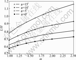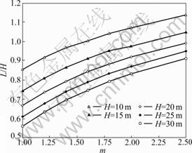 Fig.10 Effect of nonlinear parameter m on failure surface coefficient L/H with α varying from 0? to 15?