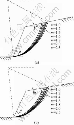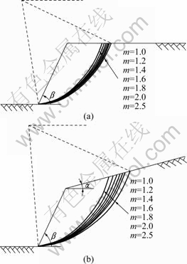 Another important outcome obtained form Figs.5 and 6is slope foot gradient β have an effect on latent slide surface: the smaller the slope foot gradient β, the larger the influence degree. For a certain slope with β being equal or greaterlarger than or equal to 30?, slipping surfaces pass through the slope toe and D/H=0 in all of the cases as shown in Figs.6(b)-(d). Failure surfaces nearly have no intersection into foundation for linear failure criterion and the failure surfaces slightly penetrate into the foundation ground with the increase of m. But for a flat slope with β=30?, from m = 1.0 to m = 2.5, the slipping surfaces pass through the slope toe firstly and deeply penetrate into foundation ground afterward.