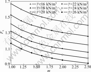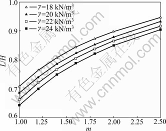 Fig.13 Critical failure surface coefficient L/H versus nonlinear parameter m for different slopes with γ varying from 18 to 24 kN/m3