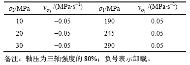 1) 首先按静水压力条件施加σ1(σ1=σ3,其中σ1为轴向应力,σ3为围压)到预定值,预定值分别为10,20和30 MPa。