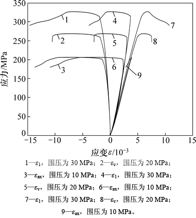 试验在中南大学力学中心MTS815型压力试验机上进行。该试验机配有伺服控制的全自动三轴加卸压、测量系统。在本次试验中,三轴加载试验采用位移加载控制方式,轴压加载速率为0.03 mm/s,围压加载速率为0.1 MPa/s,卸载试验采用荷载控制,由试验辅助软件系统程序自动控制实现,卸围压前轴压加载速率为1.5 kN/s。此花岗岩呈灰白色,岩样在天然含水状态下纵波波速为3.2~3.8 km/s,密度为2.6 g/cm3,岩样直径×长度为50 mm×100 mm,其单轴抗压强度为80 MPa。