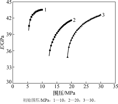 2) 在卸载过程中,岩体变形模量随围压卸载而逐渐减小,且变形模量的变化率随着围压的卸载而逐渐降低。同时,随着初始围压增大,弹性模量逐渐增大。泊松比随着围压的卸载而逐渐增大。