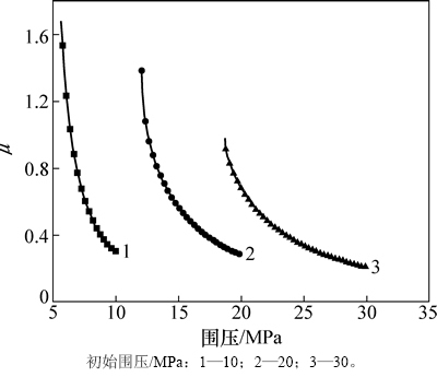 Fig. 3 Mutative curves of Poisson’s ratio and confining pressure in unloading
