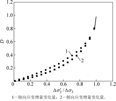 在加轴压卸围压条件下,同一时刻点的轴向应变增量变化量度略大于侧向应变增量变化量。当卸围压降低变化量为0~0.6时,轴向应变增量变化量和侧向应变增量变化量随着卸围压降低变化量的增大而基本呈线性增大的规律。在这一阶段轴向应变增量变化量和侧向应变增量变化量只增大0.3左右。这说明岩石损伤在第一阶段随着卸围压的进行缓慢发展,在这一阶段微裂缝生成并稳定地扩张,但这些裂缝不会相互作用;当卸围压降低变化量大于0.6时,轴向应变增量变化量和侧向应变增量变化量快速增大。60%~80%的应变变形发生在此阶段,说明在此卸载阶段岩石中裂隙发生大量裂隙,并迅速扩展。