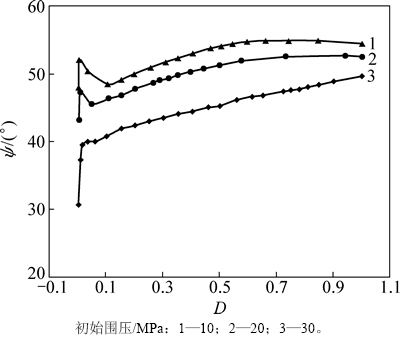 图5 剪胀角ψ随侧向应变增量变化量D的演化过程