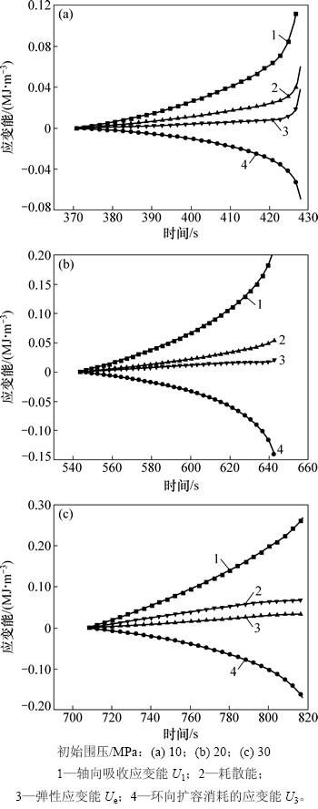 Fig. 7 Typical time-history curves of strain energy conversion for rock specimens under unloading confining pressure