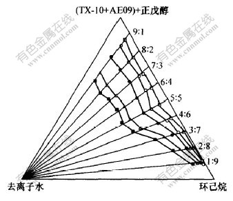 以AEO9和TX-10为表面活性剂,正戊醇为助表面活性剂,按表面活性剂与环己烷的质量比分别为1∶9,2∶8,3∶7,4∶6,5∶5,6∶4,7∶3,8∶2,9∶1配成一系列的三组分体系,在磁力搅拌器作用下缓慢均匀地用去离子水滴定每一组成分。当体系开始变为澄清透明时,即认为形成了反相微乳液,然后继续滴加去离子水,至体系变得不再透明时,即认为反相微乳液被破坏,记录由清到浊这一系列临界点并绘图。然后,用Fe3+/Co2+盐水溶液代替组分水,重复上述实验并绘图。