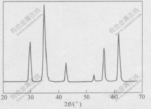 图3所示为纳米级CoFe2O4的X射线衍射图谱。可见,样品具有d值为2.97,2.53,1.97,1.48的较强衍射峰,与标准卡片数据吻合,无杂质峰,表明所合成物质为尖晶石结构的CoFe2O4。