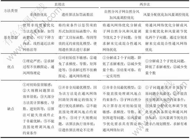 根据非线性优化理论、遗传算法和通风网络理论研究的已有成果,可将混合性通风网络优化模型求解分成直接法和两步法2个大类。直接法就是直接使用非线性优化理论[1, 4-10]或进化算法[12-14]直接求解,可分为非线性优化方法和遗传算法加罚函数法。两步法就是将混合型通风网络优化问题分成2个子问题:(1) 在满足约束条件下的分风计算;(2) 风量调节优化。按照通风网络分风方法的不同,两步法又可分为自然分风子网(即子网络中不包括需风分支)自然分风加风流调控优化和风量分配优化加风量调控优化[4, 11]2种。各种混合型通风网络优化模型求解方法比较如表1所示。