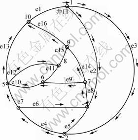 某一通风网络如图1所示[1, 5]。通风网络有10个结点,16条弧,圈起来的标号为通风网络分支标号,未圈起来的标号为通风网络结点标号,箭头表示风流方向。