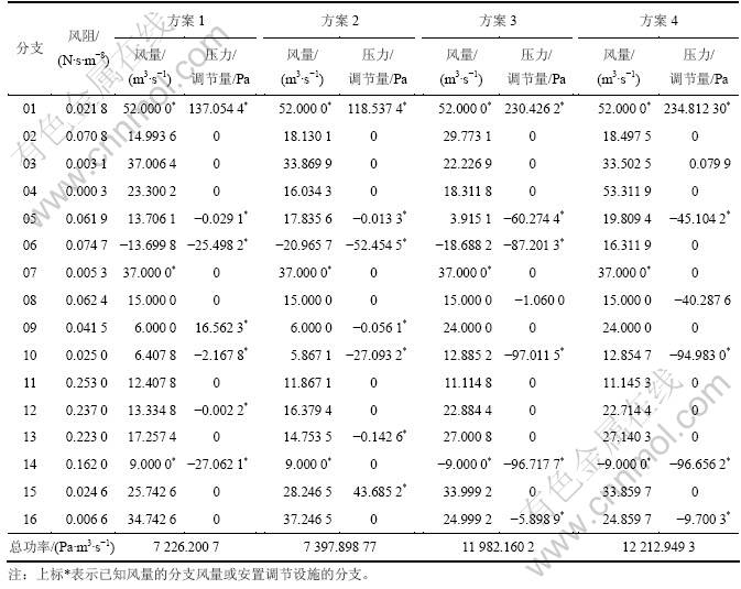 4个方案的染色体群体规模为50,交叉概率为0.8,变异概率为0.05,迭代2 000次后的结果如表3所示。经过检验计算,4个方案满足通风网络结点风量平衡、独立闭合回路风压闭合和调风地点约束条件。