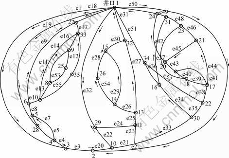 某一通风网络如图2所示[4],有35个结点,55条弧。通风网络分支e9,e11,e12,e14,e15,e27,e28,e29,e37,e40,e41,e42,e45和e46风量已知。