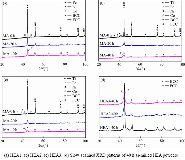 图1所示为不同球磨时间(Fe43Ni35Co22)1-xTix粉末的XRD谱。图 1(a)为HEA1粉末的 XRD谱。0 h时,各个元素的衍射峰清晰可见。当球磨时间增加到20 h,各元素衍射峰强度急剧降低,表明材料发生了合金化[28]。球磨时间增加至40 h时,衍射峰强度进一步降低。此时,粉末由FCC主相+少量BCC相组成。