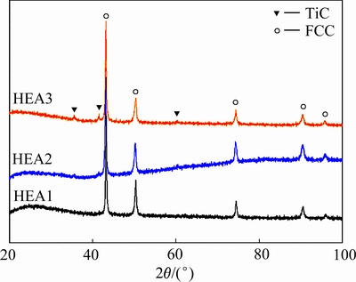 2) 经过1000 ℃的SPS烧结后,HEA2和HEA3原位生成了TiC,且随着Ti添加量的增加,TiC的含量增多。最终HEA1的相组成为FCC相+少量杂质;HEA2和HEA3则由单相FCC+TiC组成,其中FCC相为超细晶+微米晶的多尺度结构。