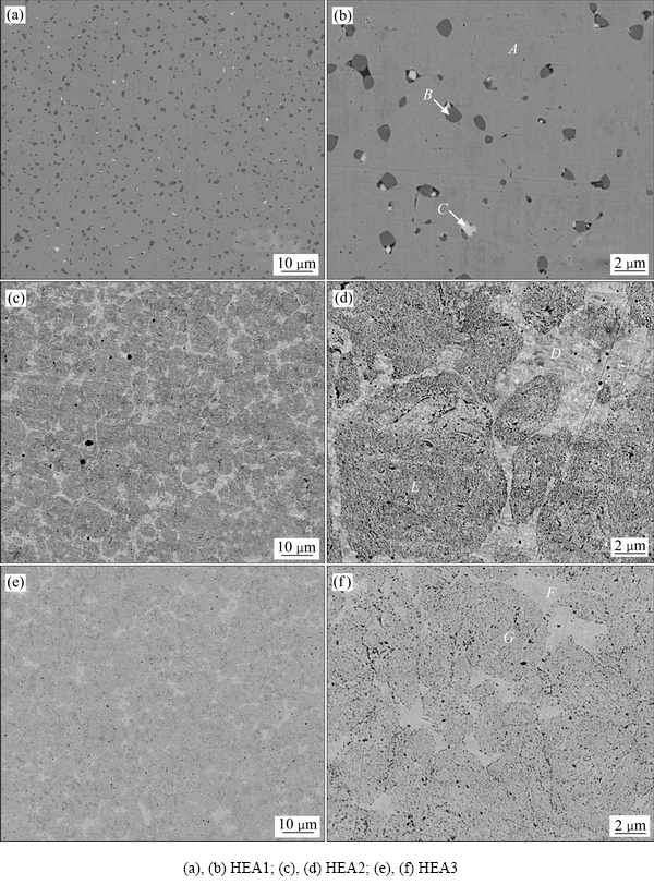 图3所示为三种高熵合金的背散射电子(BSE)照片。图3(a)~(b)所示为HEA1,可以看出,HEA1存在灰色区域(A),深色颗粒(B)以及白色颗粒(C),并且FCC基体与第二相颗粒的结合处存在孔洞。图3(c)~(d)所示为HEA2,材料的组织由白色区域(D)与灰色区域(E)组成,且存在少量的孔洞。图3(e)~(f)所示为HEA3,其组织与HEA2相似,由白色区域(F)与灰色区域(G)组成,存在较多的微观缺陷;但在HEA3中,灰色区域的占比明显提高。为了进一步分析三个材料中各个区域所表示的相,对图3中各个区域做能谱分析(EDS),每一块区域做5次能谱分析,取平均值,结果列于表1。
