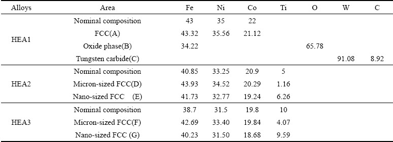 根据能谱分析结果, A区域含Fe、Co、Ni三种元素,其组成成分接近HEA1的名义成分;B区域含有氧和铁两种元素;C区域的主要元素为钨。由此推断,在HEA1中,灰色区域A为FCC基体,深色颗粒B与白色颗粒C,分别对应铁的氧化物和WC,是材料制备过程中引入的杂质。其中,铁的氧化物可能来源于粉末在空气中混粉时原始粉末的氧化[31];WC则是来自碳化钨磨球,在FeCoNi三元合金中也有出现[32]。对于HEA2,白色区域(D)与灰色区域(F)的Ti元素分布存在明显的差别;其中区域D的Ti元素含量较少,仅为1.16%,而区域(E)的Ti元素的含量较多,达到6.26%。在HEA3中,元素的分布与HEA2有相似规律。对于HEA2与HEA3,其相组成有待进一步的分析。