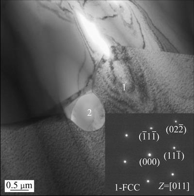 图4所示为HEA1的TEM明场像,以及晶粒1沿[011]轴的衍射斑点。可以确定晶粒1的晶体结构为FCC。HEA1的EDS/TEM结果列于表2,晶粒1中各元素都接近HEA1的名义成分,晶粒2主要含铁和氧,可以确定晶粒1为FCC基体,晶粒2为铁的氧化物,结合HEA1的SEM图像分析结果,可知HEA1包含FCC基体相、少量铁的氧化物和极微量的WC。其中,铁的氧化物与WC均为污染物。因此,HEA1的相组成可以描述为FCC相+少量杂质(铁的氧化物+WC)。