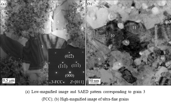 图5(a)为HEA3的明场像,以及晶粒3沿[011] 轴的衍射斑点,可知晶粒3为FCC结构;同时,可以观察到,在HEA3中形成了由超细晶区+微米晶区构成的多尺度结构。结合表2中 HEA3的EDS/TEM分析结果,可得出微米晶区为富Fe、Co、Ni的FCC相。图5(b)为HEA3超细晶区的明场像,结合EDS/TEM结果,可以判断细晶区中存在两个物相,即富Fe、Co、Ni的FCC相与TiC相。HEA3的相组成为FCC相+TiC,其中FCC相表现出多尺度结构。HEA2与HEA3有着相似的相组成和微观组织。由此推断,HEA2的相组成亦为FCC相+ TiC,且FCC为多尺度微观结构;与HEA3的区别是HEA2中的TiC更少,因此在烧结过程中阻碍晶粒长大的效果相对较弱,从而微米晶FCC相相对较多,并且超细晶的尺寸可能更大一点。