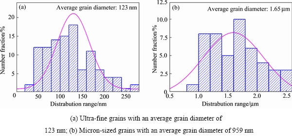 图6所示为HEA3晶粒中微米晶区和超细晶区中晶粒尺寸分布的统计直方图。根据统计结果,超细晶区晶粒的平均直径为123 nm,微米晶区晶粒的平均直径1.65 μm。与HEA1相比,HEA3的晶粒明显细化,并且出现了多尺度的结构。这主要是因为HEA3中原位生成了TiC。在烧结过程中,粉末颗粒相互接触,在粉末颗粒内部,由于TiC的存在,内部纳米晶粒的长大受阻,最终得到超细晶区。粉末颗粒之间,由于接触表面小,承受的电流过大而形成局部高温,促使晶粒快速长大,最终形成微米晶区。