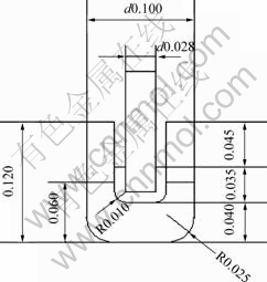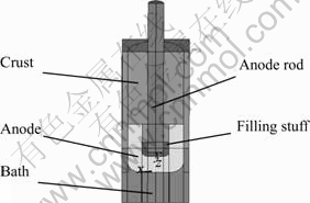 A half-anode solid model was developed according to the actual dimension (see Fig.1). The model comprises of five parts, that is anode, anode rod, filling stuff, bath and crust. The initial value of anode immersion depth was set to 6 cm, i.e. half of the anode height. Taking the heat balance into consideration, the initial value of L was set to 7.5 cm, and Fig.2 shows the anode structure briefly.