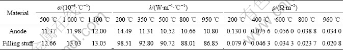 Table 1 Thermal expansion coefficient, heat transfer coefficient and resistivity of anode and filling stuff at different temperatures