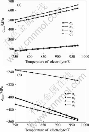 The temperature of electrolyte was changed from 750 to 970 ℃. Fig.5 shows the relevant change of thermal stress with the increase of temperature, where σmax, σmin, σx, σy, σz and σ1 mean the maximum stress, the minimum stress, x-direction stress, y-direction stress, z-direction stress and the 1st principal stress, respectively.