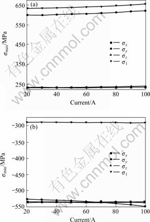 From Fig.6(a) it can be seen that with the increase of current, the maximum stress is increased but not significantly. The maximum stress of the 1st principal increases only by 3.5% (from 633 to 655 MPa). It is obvious that the tensile stress of y-direction is much bigger than that in other directions, which increases by 3.8% (from 599 to 622 MPa). From Fig.6(b) it can be seen that the change of minimum stress is small, the absolute minimum stress of y-direction stress increases only by 4.0% (from 526 to 547 MPa). The development trend of x-direction and z-direction stress is still similar.
