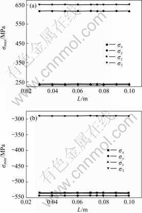 Anode cathode distance is a very important parameter in the process of aluminum electrolysis, but its effect on the stress distribution is estimated to be small. The increase or decrease of L will change the whole heat balance but have little effect on the electric and temperature distribution of anode(Fig.7). When the L increases from 0.03 m to 0.10 m, the maximum and minimum stress are almost constant, which indicates that the aspect of anode stress may not be taken into account when a reasonable L wants to be determined.