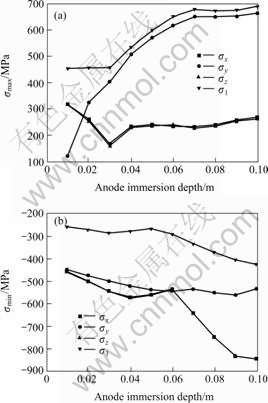From Fig.8 it can be seen that the stress distribution becomes worse when the anode immersion depth increases. The change of x-direction stress is quite similar with that of z-direction stress, and the tensile stress of y-direction is still the biggest among all directions. Fig.8 has a inflexion at 0.03 and 0.06 m anode immersion depth respectively, which may be due to different precisions of mesh, but it will not affect the total evolution trend. The maximum of the 1st principal stress increases by 52.1% (from 453 to 689 MPa) and the maximum stress of y-direction increases by 447.9% (from 121 to 663 MPa). The absolute minimum of the 1st principal stress increases by 65.0% (from 257 to 424 MPa) and the absolute minimum stress of y-direction increases by 19.0% (from 448 to 533 MPa). Considering its effect and other factors synthetically, the reasonable value of anode immersion depth is in the range of 0.03 - 0.06 m.
