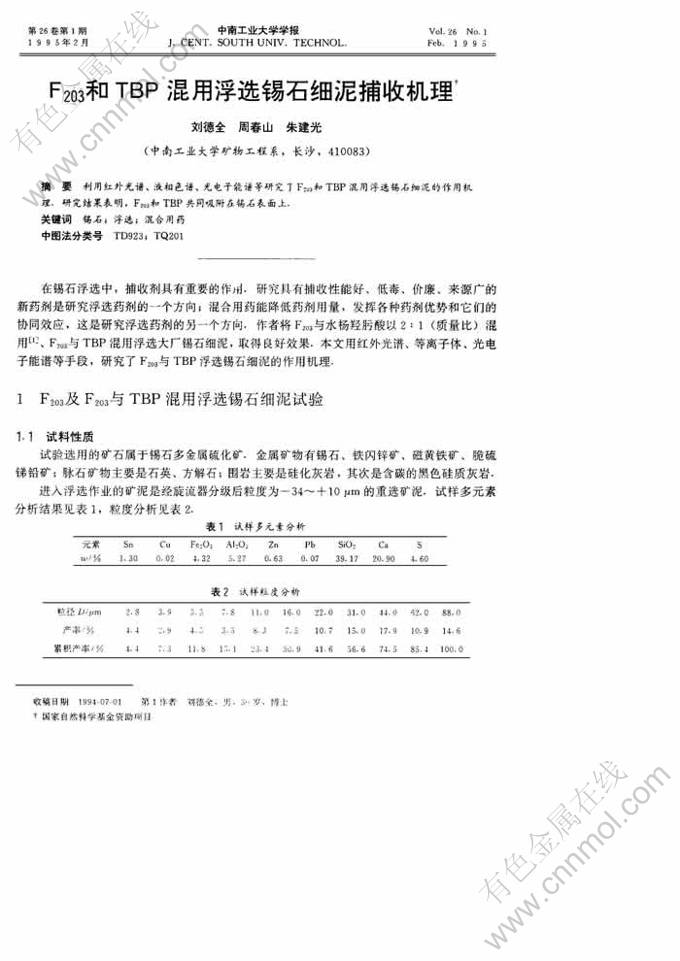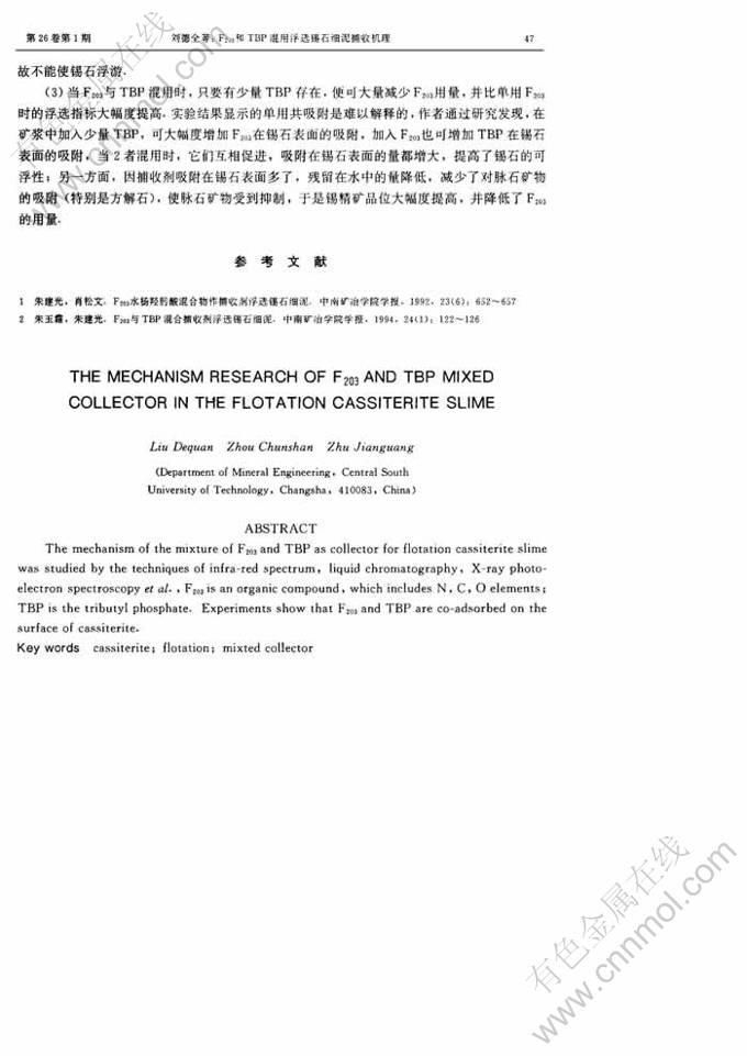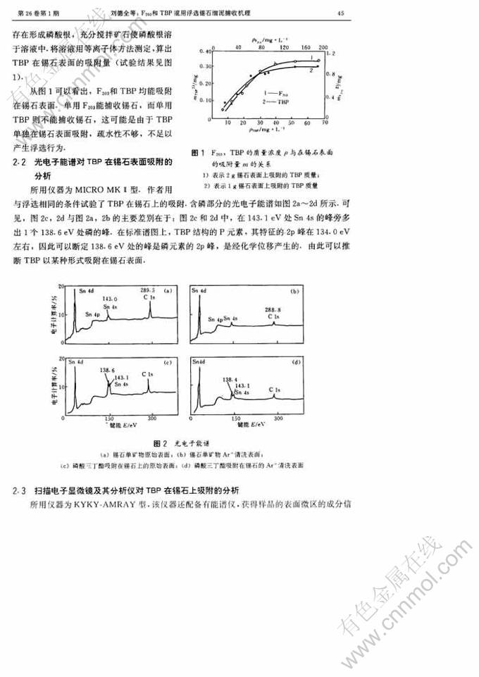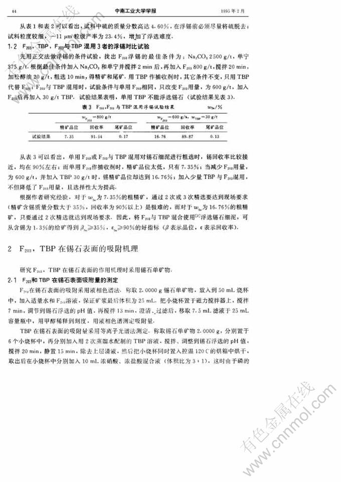 摘 要:利用红外光谱、液相色谱、光电子能谱等研究了F203和TBP混用浮选锡石细泥的作用机理.研究结果表明,F203和TBP共同吸附在锡石表面上.