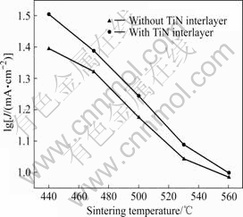 Fig.7 Relationship between current density and sintering temperature at φ=1.4 V