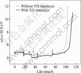 3) TiN中间层具有良好的稳定性,与基体结合牢固,可以延长钛阳极的使用寿命。强化寿命测试表明制备温度低于500 ℃时, TiN中间层的存在可以明显地增加涂层钛阳极的使用寿命。