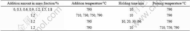 The material used in this work was a commercial AM60B alloy and its composition is Mg-5.98Al- 0.343Mn-0.023Si (mass fraction, %). A quantity of AM60B alloys was processed in the sequence of remelting, adding MgCO3, holding, cooling to pouring temperature and pouring, and some cast rods with dimensions of d16 mm×150 mm then were obtained. The used mould was a permanent mould and its temperature was room temperature when pouring. During melting, the melt was protected by a RJ2 covering reagent. The detailed parameters are listed in Table 1, which indicates that four parameters, such as addition amount, addition temperature, holding time and pouring temperature, were considered, and when one parameter varied, the others were kept constants.