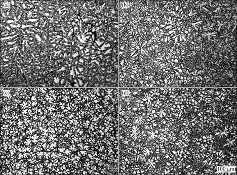 Fig. 1 Microstructures of AM60B alloys refined by different amounts of MgCO3: (a) 0%MgCO3; (b) 0.3%MgCO3; (c) 1.2%MgCO3; (d) 1.5%MgCO3