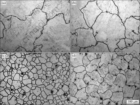 Fig. 2 Microstructures of AM60B alloys shown in Fig. 1 after being solutionized at 420 ℃ for 8 h: (a) 0%MgCO3; (b) 0.3%MgCO3; (c) 1.2%MgCO3; (d) 1.5%MgCO3