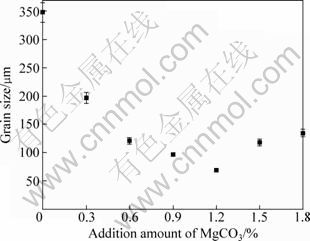 Fig. 3 Variation of grain size with addition amount of MgCO3