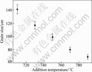 Figure 4 presents the variation of grain size with addition temperature of MgCO3. It shows that the grain size continuously decreases as the temperature rises. It is known that MgCO3 will decompose into CO2 and MgO. The C element that is needed by forming the Al4C3 substrates should be from reactions between the released CO2 and alloying elements in the melt. The higher the temperature is, the more easily the decomposition is. So, it can be expected that proper increasing the temperature can increase the substrate number. In addition, in view of thermodynamics, the substrate size should decrease with increasing the temperature when the formed substrate amount is given, and thus their number must increase. More importantly, the decrease in size can also improve their nucleation potency [18]. Because of these three reasons, the grain size continuously decreases with increasing the addition temperature.