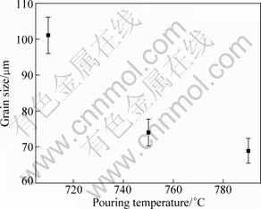 Figure 6 gives the variation of grain size with pouring temperature. It shows that the grain size decreases as the temperature rises. The highest pouring temperature is 790 ℃, similar to the addition temperature or holding temperature. Under this condition, the melt is treated by MgCO3 at 790 ℃, followed by holding for 10 min and pouring at the same temperature. But under the other conditions, the treated melts must be cooled to pouring temperatures because the addition temperature is higher than the pouring temperature. The lower the pouring temperature, the longer the time needed by cooling, and thus the more serious the inoculation fading. In addition, it should be pointed out that the growth or coalescence of the substrates can be enhanced as the melt’s temperature reduces, not only decreasing the substrate number, but also reducing the nucleation potency. Namely, the inoculation fading under these conditions also includes the coalescence of substrates besides the agglomeration and settlement discussed above. Furthermore, similar to the effect of addition temperature, the role played by superheating regime should also be decreased. Due to these two reasons, the grain size decreases with increasing pouring temperature.