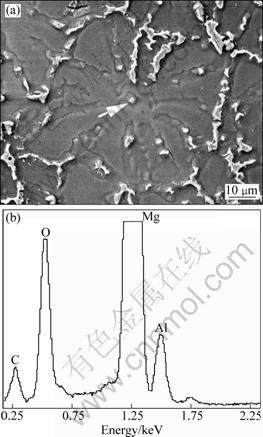 In the present work, as shown by the arrow in Fig. 7(a), there is always a small particle in the center of each equiaxed dendrite of the alloy refined with 1.2% MgCO3. This particle can be considered the nucleus of the grain. The result from EDS indicates that this particle consists of C, Al, O and Mg (Fig. 7(b)). It is believed that the peak of Mg element should originate from the magnesium matrix [17]. So, the particle actually includes C, Al and O.