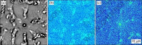 Small specimens with dimensions of d16 mm× 10 mm were cut from the obtained cast rods and finished and polished by standard metallographic techniques. Then they were etched by an aqueous solution containing glycerol, nitric acid, hydrochloric acid and acetic acid and observed on an optical microscope (OM). To delineate grain boundaries and quantitatively examine grain size, the specimens then were solutionized at 420 ℃ for 8 h and water-quenched. They were processed again according to the above procedures for preparing metallographic specimen and also observed under the OM. The obtained images were analyzed by Image-Pro Plus 5.0 software. Three images with magnification of 200 times for each specimen were examined and the average was taken as the specimen’s grain size. To verify grain refining mechanism, the specimen refined by 1.2% MgCO3 was observed and analyzed by scanning electron microscope (SEM), energy dispersive spectroscope (EDS) and electron microprobe analyzer (EPMA).