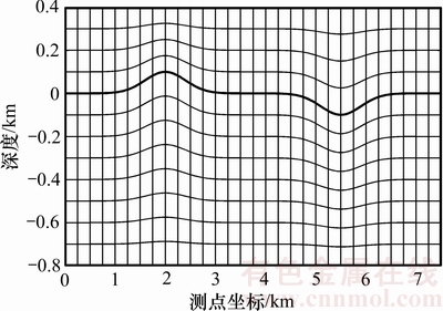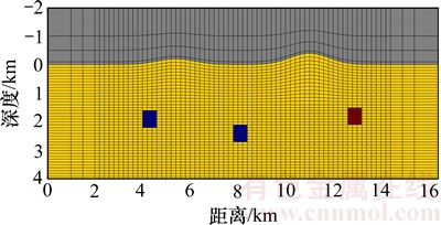 设计如图3所示的二维起伏地形模型,地表共有2个山脊地形,其最高点高度分别为200 m和400 m,大地介质的视电阻率为100Ω·m。地下存在3个矩形异常体,其宽度与高度均为600 m,左侧2个是电阻率为10Ω·m的低阻体,其顶端埋深分别为1.6 km和2.1 km;最右侧是电阻率为1.0 kΩ·m的高祖异常体,其顶端埋深为1.5 km。模型总水平跨度为16.4 km。地下深度小于4.0 km。