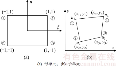 表示四边形单元节点i (i=1, 2, 3, 4)的坐标,则双线性插值的形函数可表示为如下形式: