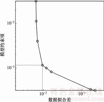 过大时,强调模型的光滑度而忽略数据的拟合程度,加大了原问题与新问题之间的偏离程度,得到的模型可能会过于简单,数据得不到充分拟合。而L-curve法是由HANSEN等[19-20]提出的正则化参数选取方法,因绘制出的曲线形状呈“L”形而得名。该方法通过绘制正则解的范数