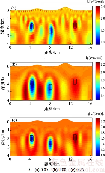 选用图5所示的正则化参数λ分别为0.05,0.25和4.00的反演结果。从图5可见:因λ不同导致反演结果存在显著差异,其中图5(c)所示的λ=0.25时反演剖面中异常体的位置和大小均清晰地得到反映,低阻异常体电阻率准确得到体现,但高阻异常体电阻率偏低。这是由于高阻异常体的正演分辨率较低,导致反演对高阻体不敏感。图5(a)所示为正则化参数λ=0.05时的反演剖面,由于正则化参数选取过小,背景平均视电阻率出现波动,且异常体的特征也有所形变。图5(b)所示为正则化参数λ=4.00时的反演剖面,当正则化参数选取过大时,电阻率异常与背景过于平缓,从而导致异常面积过大,模型约束过度导致反演结果不准确。