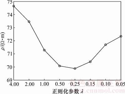 为反演网格的电阻率。以正则化参数递减的顺序计算每次结果与原模型的误差,可以从图6中看出L-curve法选取的最佳正则化参数的反演误差为曲线最低点,这说明通过L-curve法选取最优正则化参数能有效提高反演质量。