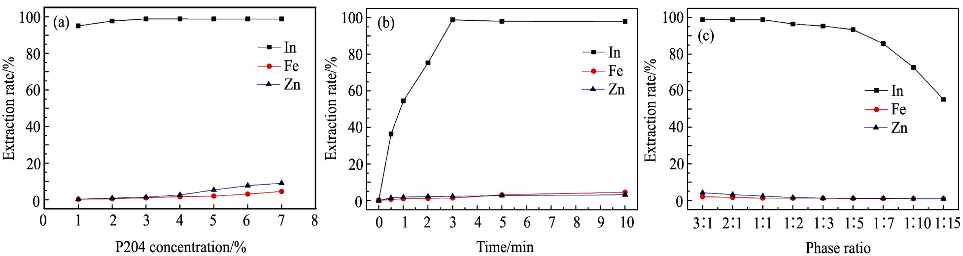 实验采取单因素实验法, 使用分液漏斗单级萃取萃原液中铟, 有机相使用萃取剂P204和稀释剂DT100, 固定萃原液的pH值, 控制的因素分别为P204浓度、 萃取时间、 相比, 研究铟的萃取效果以及铟与铁和锌的分离效果。