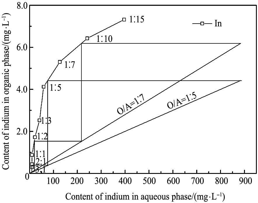 通过图7 (c) 得到图8萃原液中铟的萃取等温线及其McCabe-Thiele图, 可确定相比 (O/A) 为1∶5和1∶7时, 铟的理论萃取级数为2级连续萃取。
