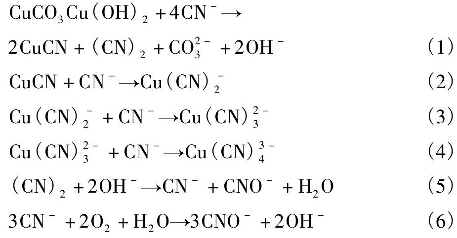 孔雀石( Cu CO3Cu ( OH)2) 在氰化浸出过程中与Na CN发生反应,其产物Cu CN可与CN-继续反应生成Cu( CN)2,Cu( CN)23,Cu( CN)34等配合物[11,12,13,14,15],造成氰化物消耗,主要反应如下: