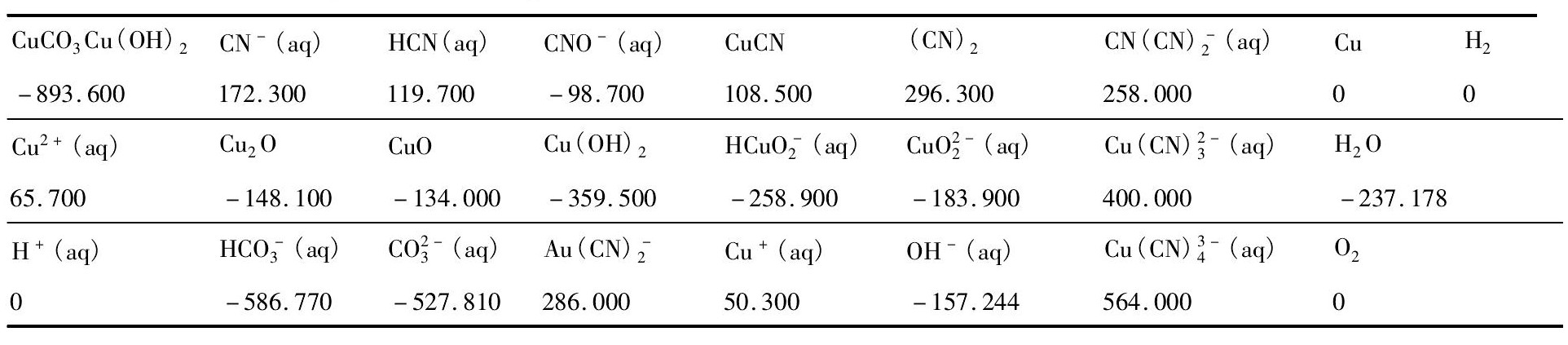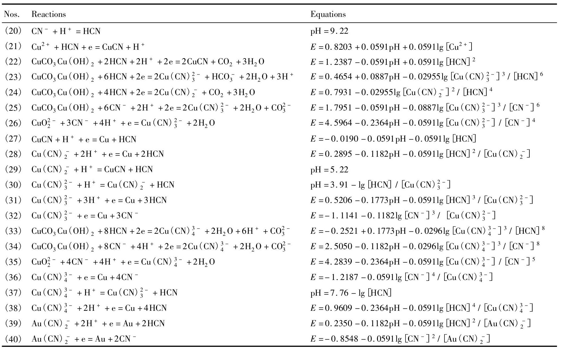 表4 Cu CO3Cu( OH)2-CN-H2O 体系和 Cu CO3Cu( OH)2-Au-CN-H2O 体系的反应式与 E-p H 平衡式( 298. 15 K ) Table 4Equilibrium reactions and E-p H equations of Cu CO3Cu ( OH)2-CN-H2O system and Cu CO3Cu ( OH)2-Au-CNH2O system at 298. 15 K