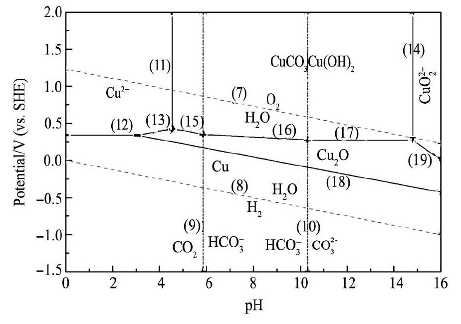通过计算得到Cu CO3Cu ( OH )2-H2O体系Ep H平衡式结果( 见表3) ,绘制的Cu CO3Cu( OH)2H2O体系E-p H图见图1。